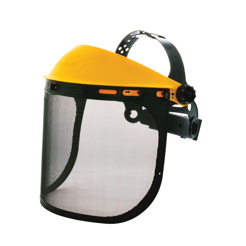 Ασπίδιο προσώπου με προστατευτικό δίχτυ, με ρυθμιζόμενη διάταξη προσαρμογής στο κεφάλι με κοχλία.