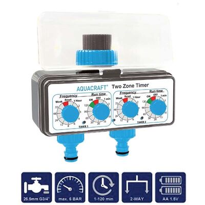 - Χρόνος ποτίσματος 1,3,5,10,15,20,30,60,90,120 λεπτά και χειροκίνητη λειτουργία On/Off.