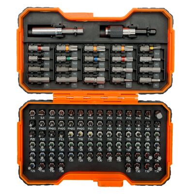 - Σετ μυτών 100 τμχ. για βίδες με ίσια κεφαλή, με κεφαλές Phillips, Pozidriv, Εξάγωνες, Robertson και με χρωματιστές κεφαλές TORX®, TORX® Tamper