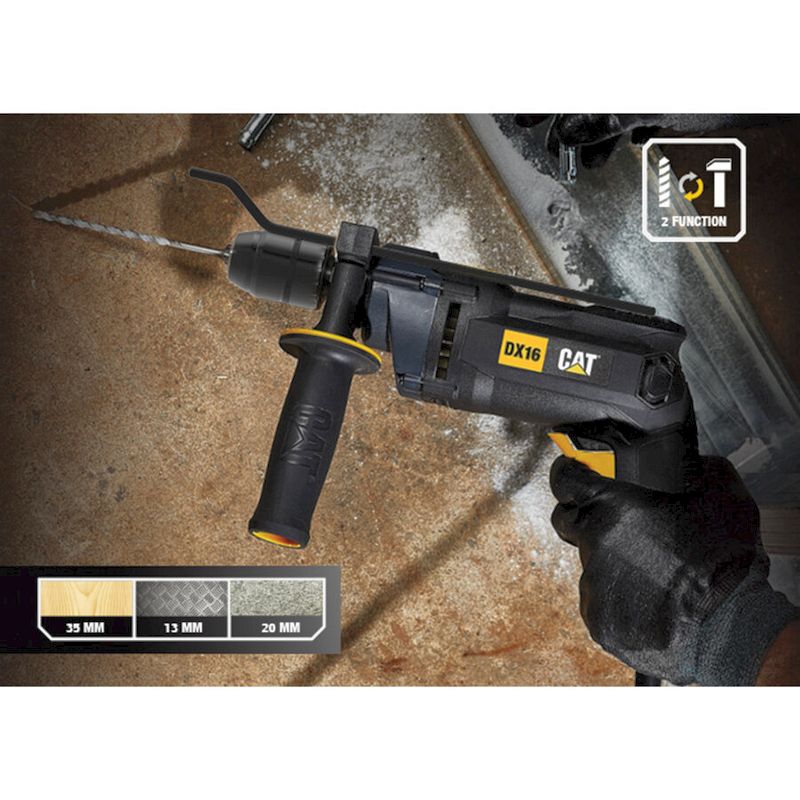 Το δράπανο κρουστικό CAT DX16 είναι ένα ισχυρό εργαλείο με ισχύ 850W. Διαθέτει διακόπτη κλειδώματος για εύκολη και γρήγορη αλλαγή εξαρτημάτων. Ο μεταλλικός μετρητής βάθους επιτρέπει ακριβή ρύθμιση του βάθους διάτρησης. Η δεξιόστροφη/αριστερόστροφη κίνηση και το κιβώτιο ταχυτήτων αλουμινίου προσφέρουν ευελιξία και έλεγχο στην εργασία. Ο διακόπτης μεταβλητής ταχύτητας επιτρέπει τον έλεγχο της ταχύτητας ανάλογα με την εργασία. Επιπλέον, η λαβή με επικάλυψη από λάστιχο υψηλής ποιότητας προσφέρει άνεση και σταθερό κράτημα, ενώ το μεταλλικό τσοκ χωρίς κλειδί διευκολύνει την αλλαγή των εξαρτημάτων.